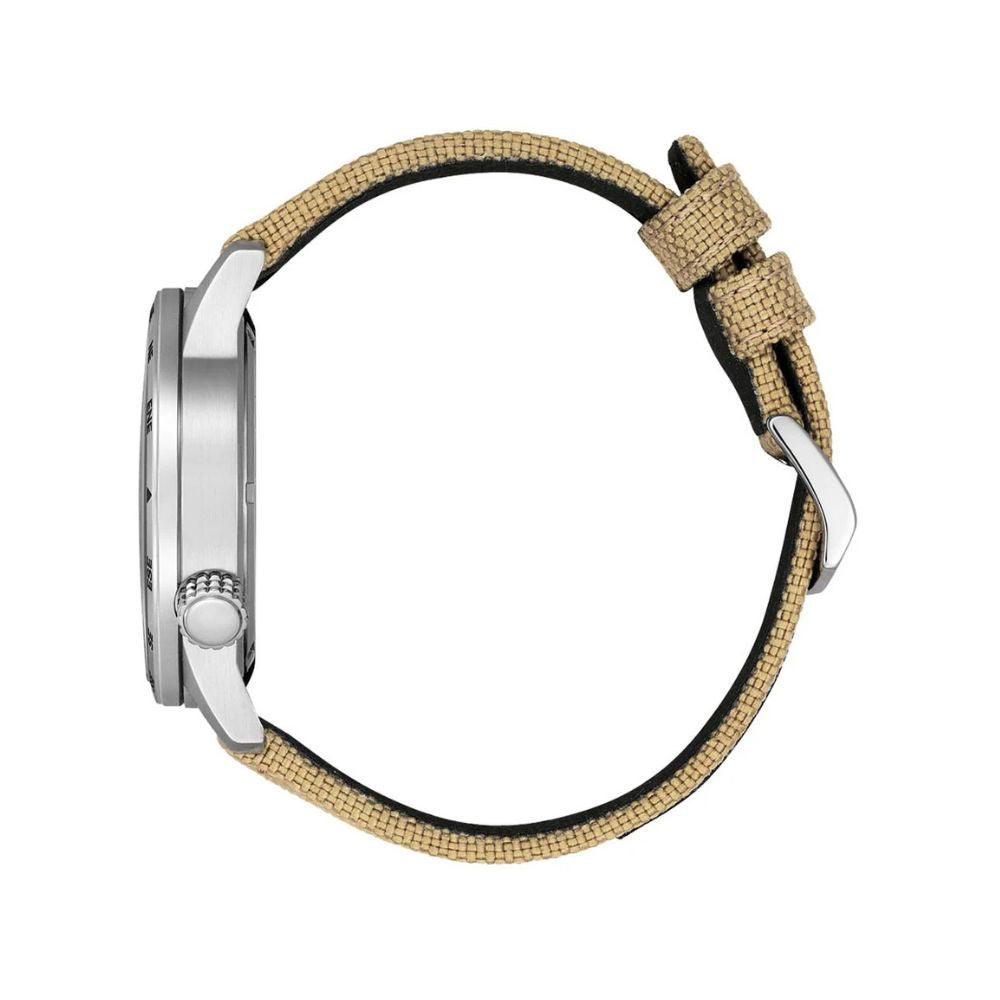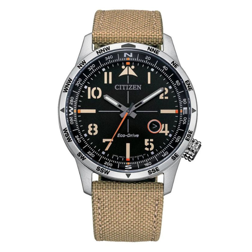 This aviator-style addition to Citizen's Eco-Drive collection is sure to turn heads. This watch features a brushed stainless-steel case and compass-inspired black dial with iconic crosshair design, bold luminous markers, and grey and orange hands. Additional features include a khaki nylon strap and water resistance of 100 meters.