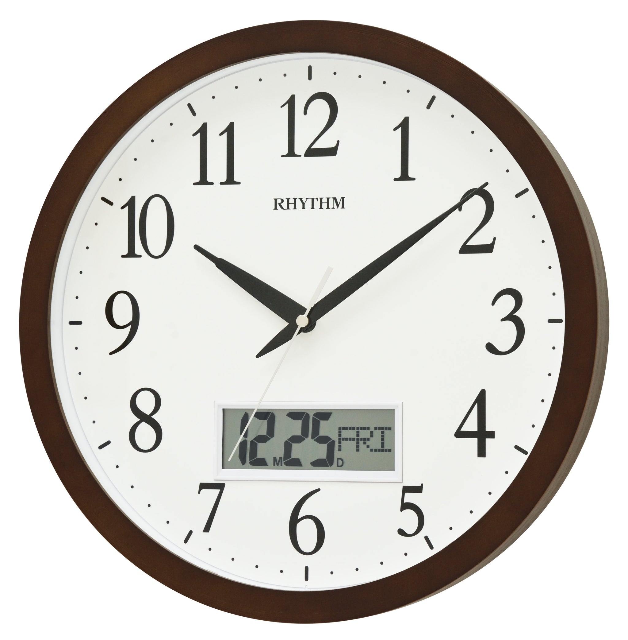 A smart combination of classic analogue design and modern practicality, this Rhythm wall clock features a built-in LCD calendar display that keeps the date clearly visible at a glance.