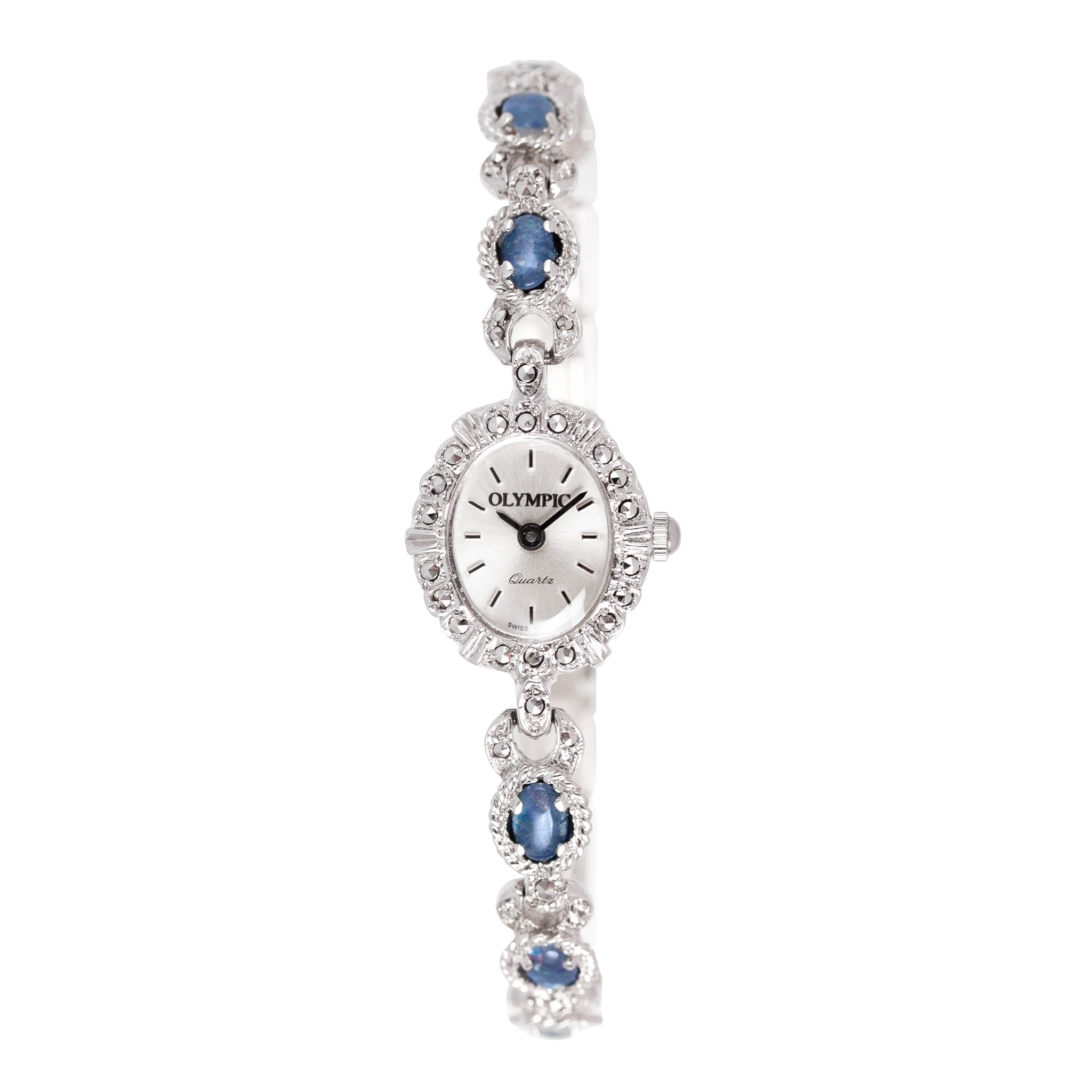 An elegant marcasite watch crafted in sterling silver and finished with genuine opal accents. The petite round dial is framed with sparkling marcasite, while the bracelet features oval opal stones set into detailed silver links. Powered by a precise Swiss quartz movement, this piece combines classic jewellery styling with everyday reliability.